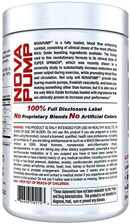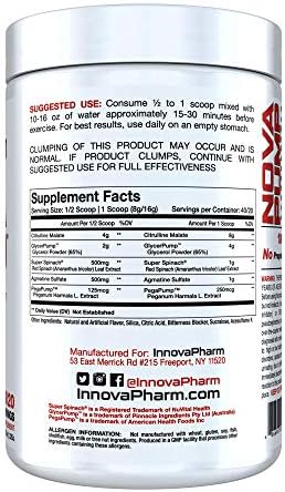 NovaPump is a cutting-edge vasodilator and nitric oxide pre workout supplement scientifically formulated to throttle performance and amplify muscle pumps. Conventional pump pre workouts rely on a rather “standard” mix of citrulline, arginine, and glycerol to boost nitric oxide production and enhance blood flow. While this offers an adequate solution to pumps and performance, “adequate” is not in InnovaPharm’s vocabulary. To create a truly one-of-a-kind pump pre workout, we invested countless hours in R&D to create a formula that is innovative, and, above all, effective! NovaPump attacks the problem of increasing blood flow from multiple fronts to create a formula that results in unabated nitric oxide production, blood flow, and muscle pumps. NovaPump is 100% free of banned substances, and can be taken by any athlete, weightlifter, or casual gym rat (male or female) seeking improved performance, reduced fatigue, and of course, bigger, nastier, longer-lasting muscle pumps. NovaPump contains NO stimulants and can be used on its own or stacked with your favorite stimulant-inclusive pre workout such as Limitless or NovaRage Xtreme. It’s perfect for those late night training sessions when you want a boost in performance but don’t want to deal with the disrupted sleep. NovaPump is also great for those times you may be cycling off stimulants all together. Regardless, NovaPump is your anytime, anywhere pump pre workout solution. Benefits of NovaPump At-A-Glance Enhances nitric oxide production Boosts power output Promotes greater blood flow Improves nutrient delivery to working muscles Fatigue resistance Supports cardiovascular health Limits arginase activity Supports healthy blood pressure. Clumping of this product may occur and is normal.